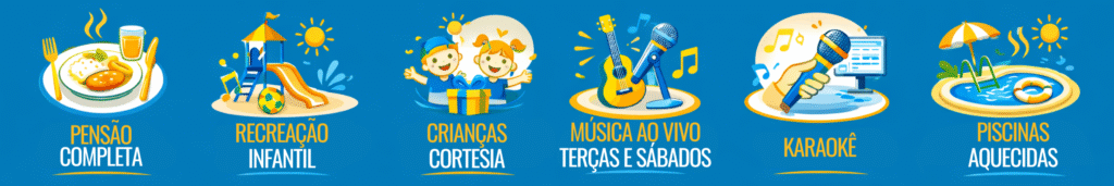 No pacote já está incluso recreação para todas as idades, pensão completa (café da manhã, almoço de jantar), música ao vivo, jantares temáticos e acesso total ao parque aquático. 😍